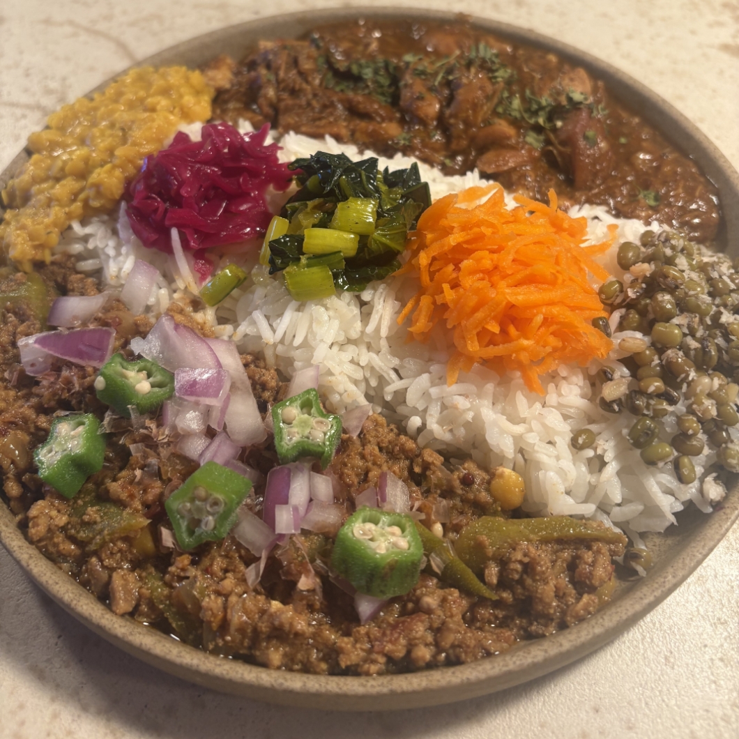 当店のカレーはあいがけカレーと数種類の副菜が一皿に乗っており、少しずつ色々混ぜながらお召し上がりください。混ぜるたびに味の変化がお楽しみいただけます♪カレーに合うように配合したカルダモン、シナモンなど様々なスパイスを使った自家製焼酎もご用意しております。アットホームな空間でお待ちしております☆